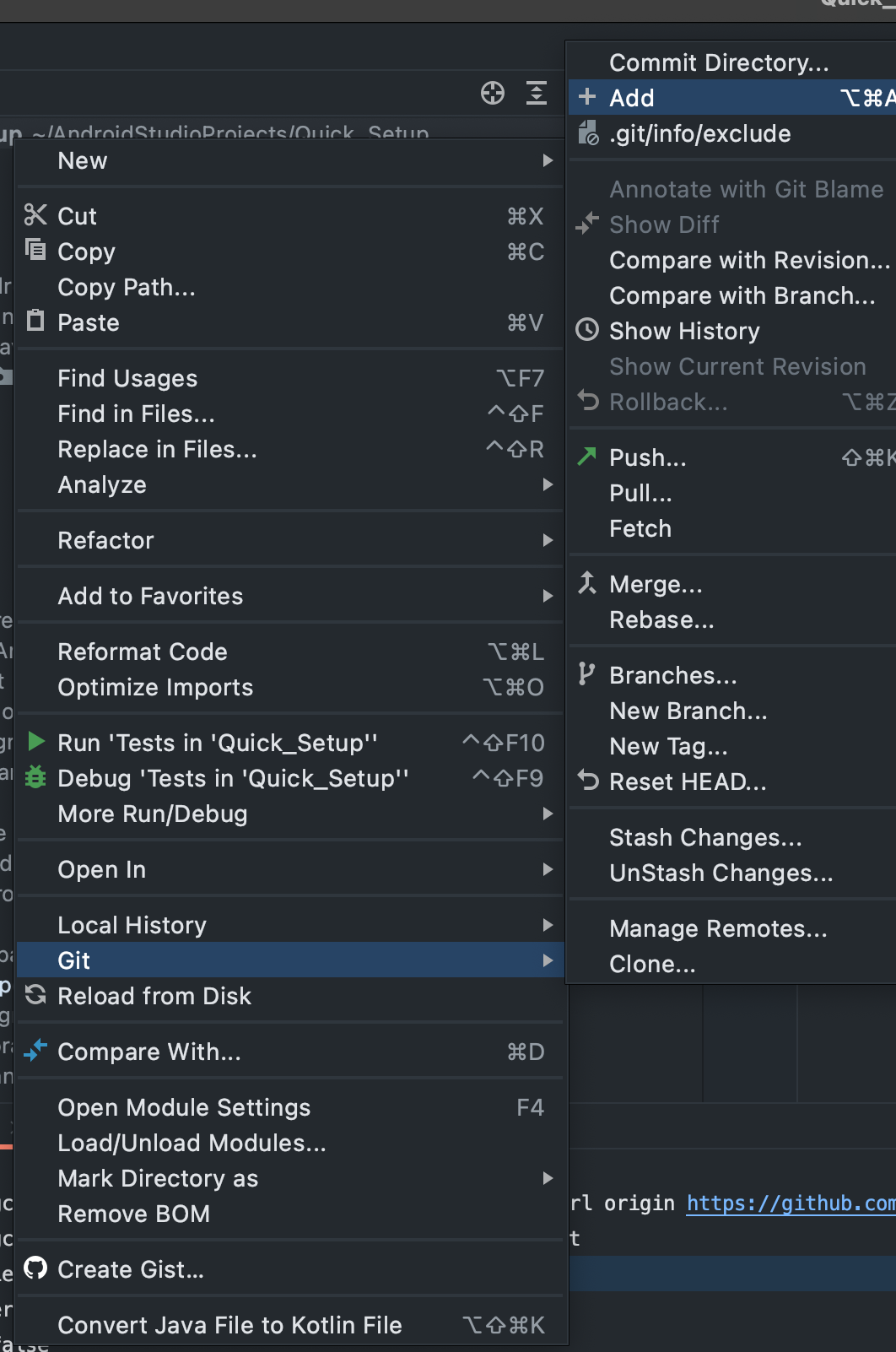 마지막으로 파일 구조를 Android 에서 Project 로 변경 후 프로젝트 최 상단 파일을 눌러 git -> add 를 눌러주고 커밋해주면 끝입니다!
